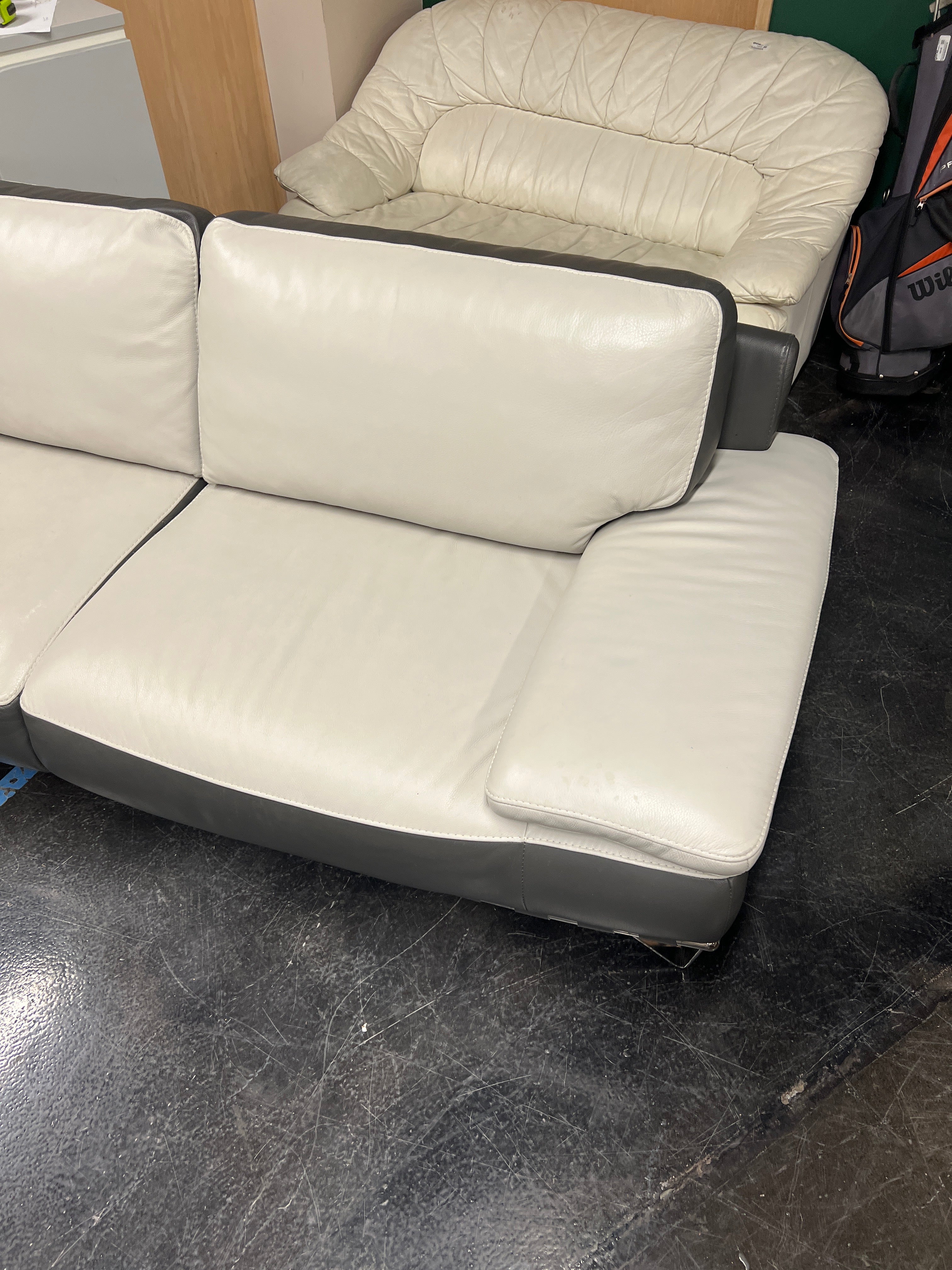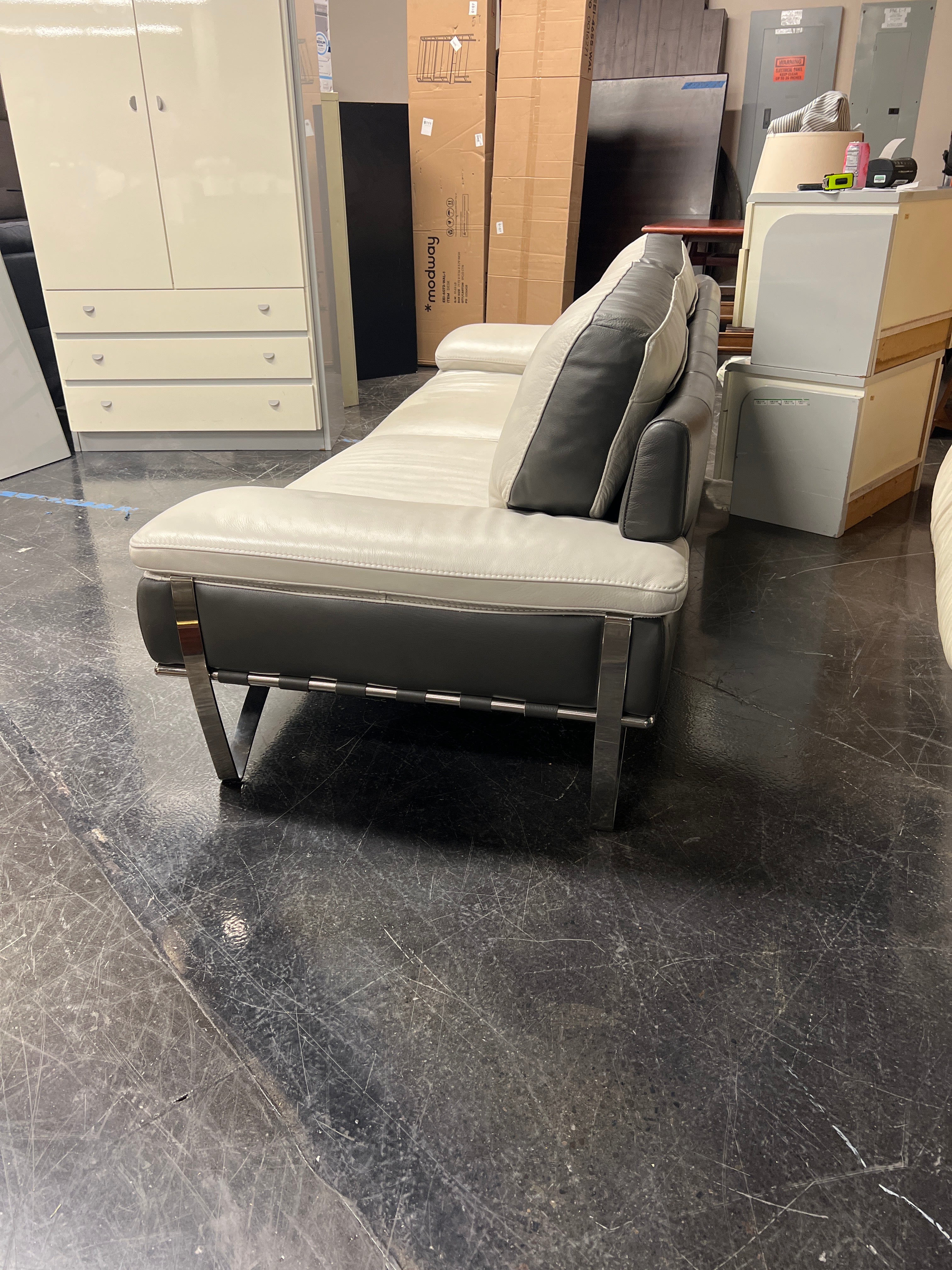 Curved, two-tone leather upholstery in beige and dark gray. Features a sleek, brushed metal frame. The design incorporates a distinct segmented back. Comfortable seating with well-defined cushions.