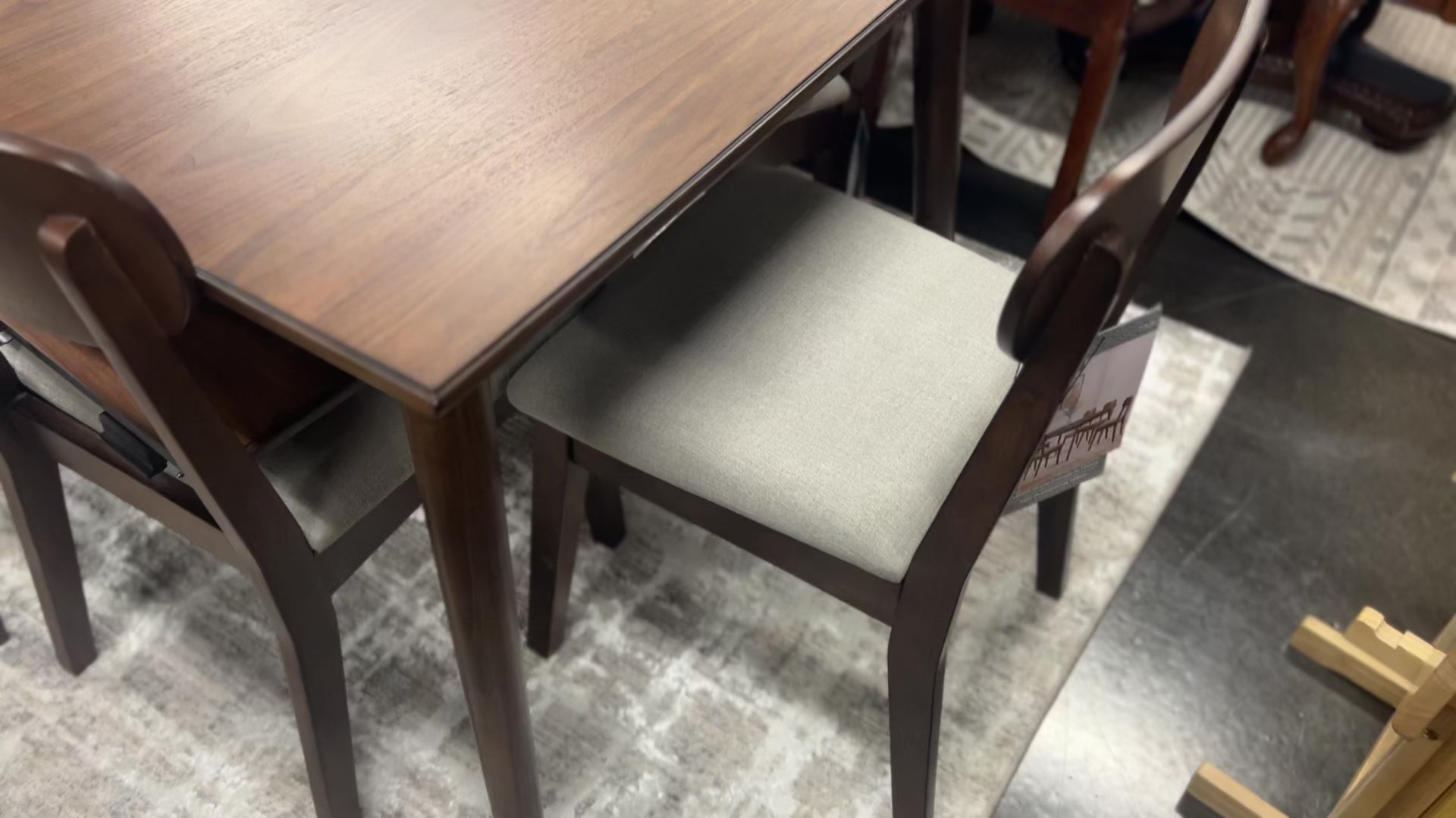 Stylish dining set with a brown wood table and beige upholstered chairs. Ideal for both small and large gatherings. For additional details, visit: https://www.costco.com/palm-bay-7-piece-dining-table-set.product.4000262444.html. Table Dimensions: 40 in. x 60 in. x 30.2 in. Condition: Scuffs and scratches consistent with ordinary use.