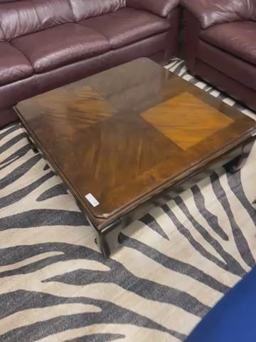This timeless 1972 Thomasville coffee table made from solid brown wood adds a vintage touch to any living space. Dimensions: Height: 15 in, Width: 39 in, Depth: 39 in.